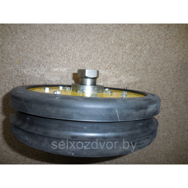 Колесо прикатывающее 286х74 мм с шиной атмосферного давления сеялки «Берегиня» АП-652. Шина мягкая, легко деформируется, несмотря на то, что резина толстая. На глинистых почвах будет залипать. Принцип работы отличается от всех предыдущих вариантов, т.е создает давление не сверху на семя, а на края бороздки, поджимая зерно с боковых сторон.