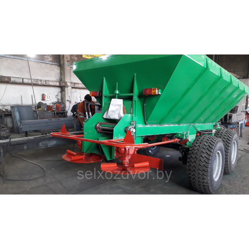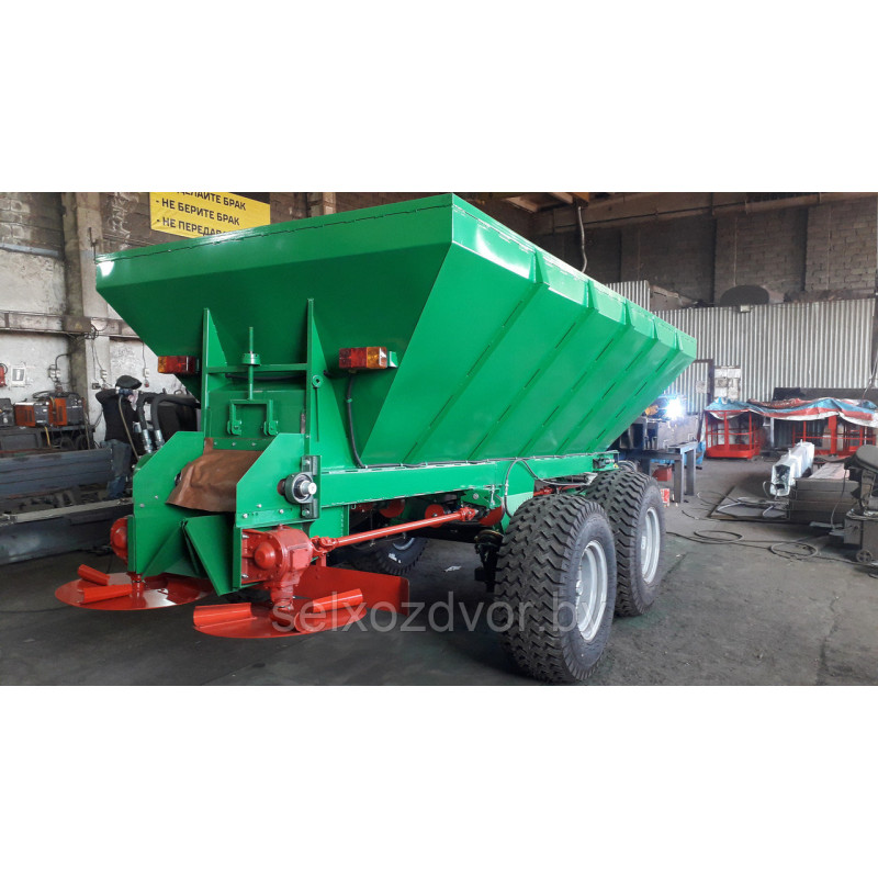Конструкция:Составные части машины: кузов с рамой, привод рабочих органов, тележка балансирная, транспортер, рассеивающие центробежные диски, дозирующая заслонка, туконаправитель, рабочий пневматический тормоз и ручной стояночный механический тормоз, оборудование светосигнальное, приспособление для равномерной разгрузки кузова.