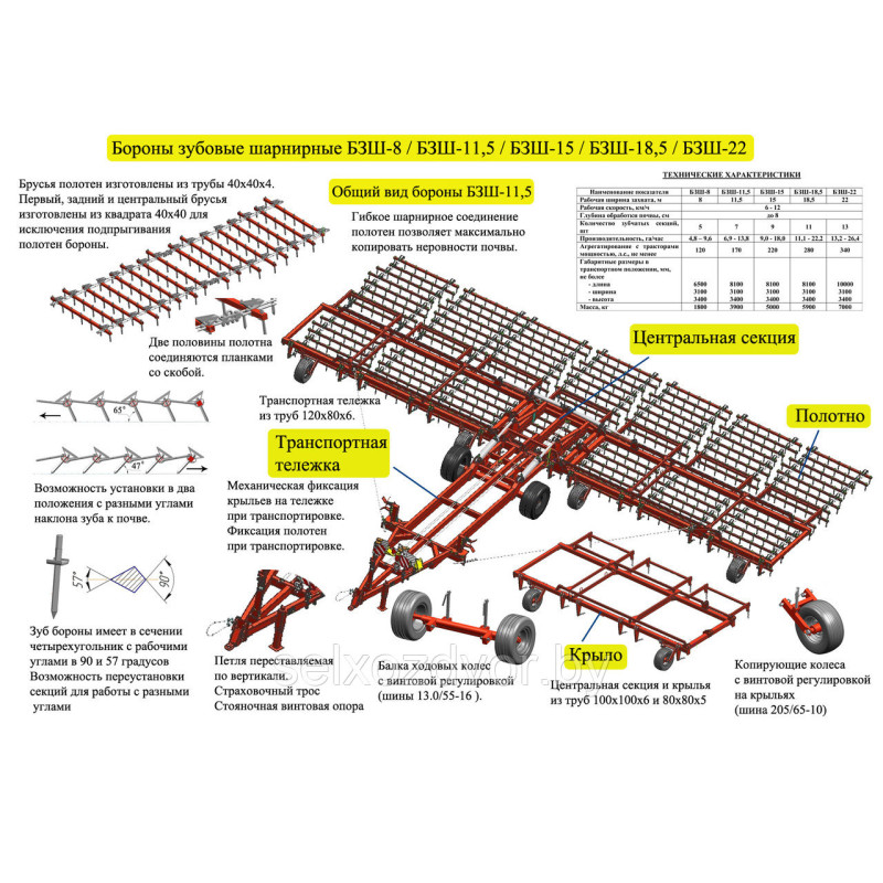 Борона зубовая шарнирная БЗШ предназначена для выравнивания и рыхления верхнего слоя почвы, уничтожения сорняков в начальной фазе развития, предпосевной обработки, заделки минеральных удобрений, высеянных разбросанным способом.