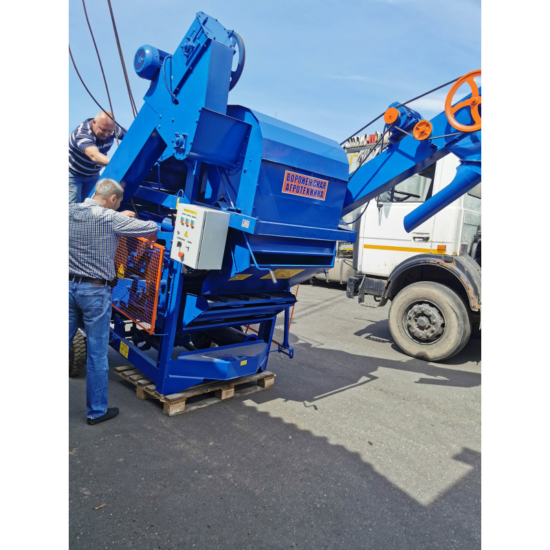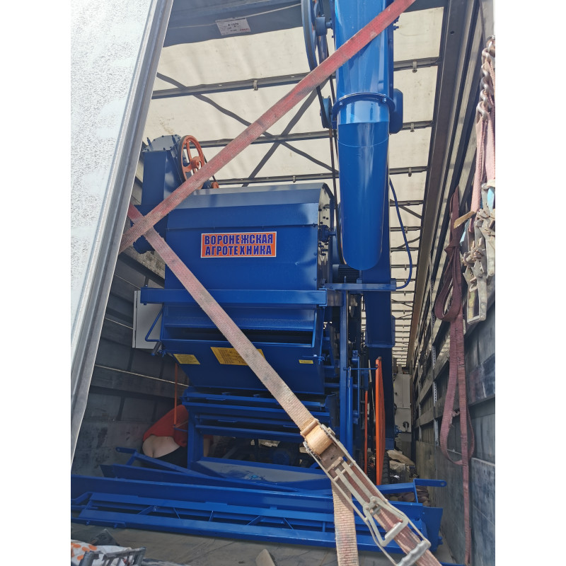 При движении машины вдоль вороха шнековые питатели захватывают зерновой материал и подводят к подъемной трубе загрузчика, который передает его в распределительный шнек питающего устройства. Питающее устройство распределяет зерно по ширине камеры. Распределитель делит материал на две равные части и направляет его в воздушные каналы. Воздушный поток через вентилятор и пыле-отделитель уносит легкие примеси в пневмотранспортер. Более крупные примеси из воздушного потока улавливает отстойная камера.