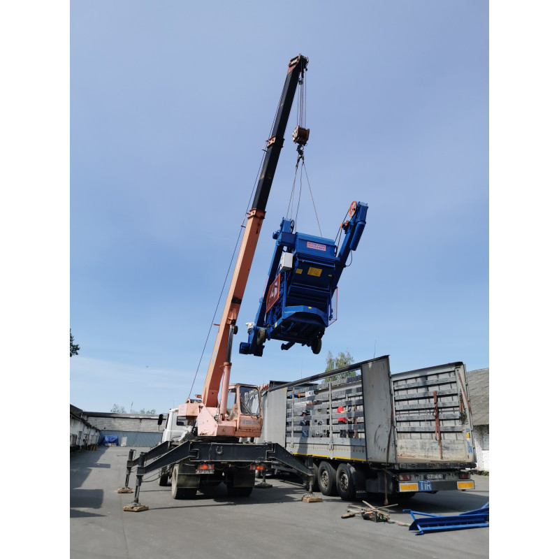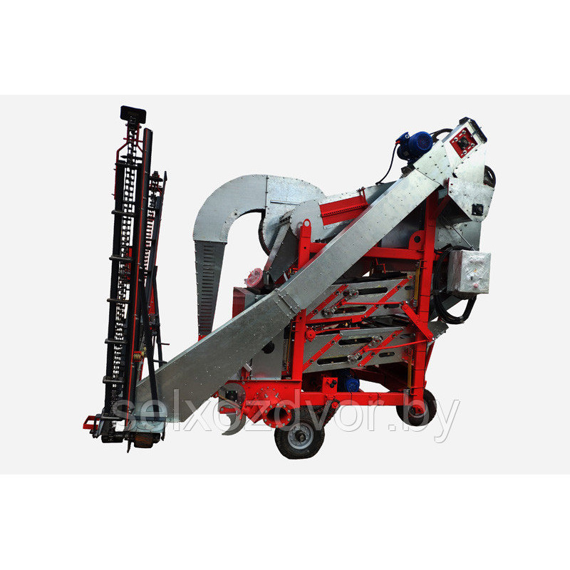 Зерновой материал, прошедший очистку воздухом и разделенный на две равные части, попадает на верхний и нижний станы. Процесс очистки на верхнем и нижнем станах совершенно одинаков. Чистое зерно поступает в задний приемник. Из приемника чистое зерно шнеком подается в нижнюю головку отгрузчика. Отгрузочный транспортер выводит чистое зерно из машины и поворотным носком направляет его либо в кузов автомашины, либо образует за машиной ворох чистого зерна. Легкие примеси, выделенные воздушной очисткой, пневмотранспортер относит в сторону.