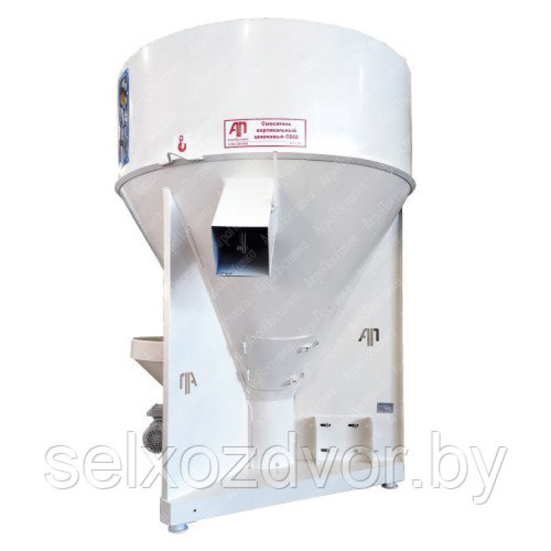 Смеситель СВШ-1,5Ш комплектуется шнеком принудительного ввода добавок. Белково-минеральные компоненты комбикорма (премиксы, БМВД, БМВК) засыпаются в боковой патрубок и горизонтальным шнеком с собственным приводом подаются в основной (вертикальный) шнек смесителя.