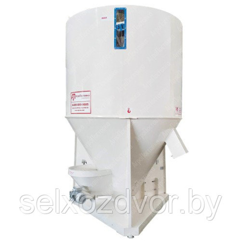 Смеситель имеет шнек принудительного ввода добавок и смешивающий шнек увеличенного диаметра. Компоненты комбикорма подаются пневматической дробилкой один за другим, смеситель установлен на весовом устройстве, что позволяет дозировать компоненты по весу согласно разработанному рецепту.