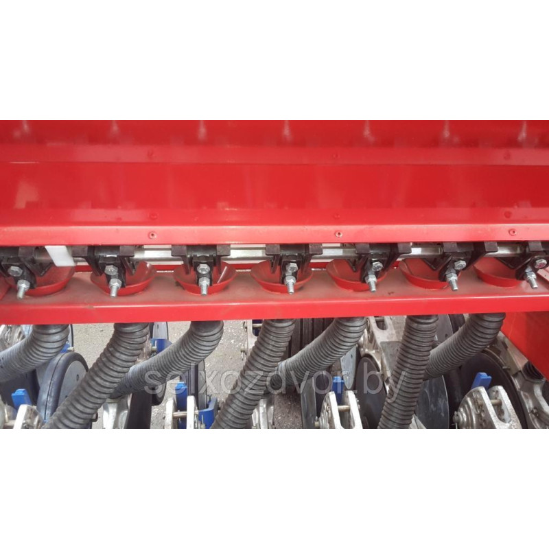 3. Пружинно-гидравлический механизм управления сошниковой группой позволяет устанавливать точную глубину заделки семян, которую можно изменять с помощью прикатывающих колес в широких пределах от 20 до 110 мм. Плавающая установка сошников на раме сеялки позволяет устанавливать любую необходимую величину междурядья присева от 15 см и выше.