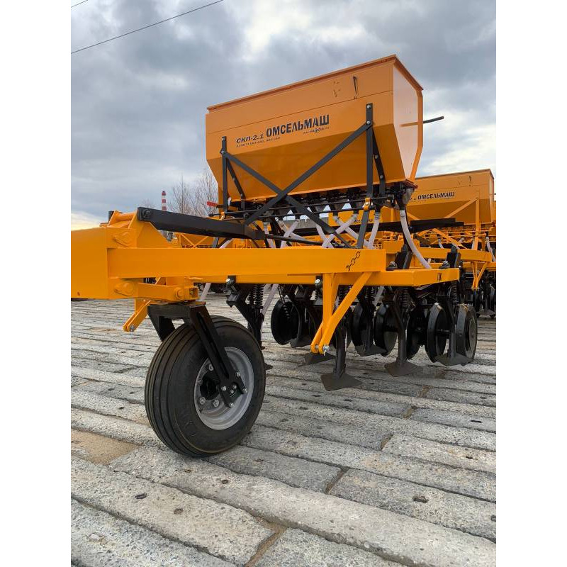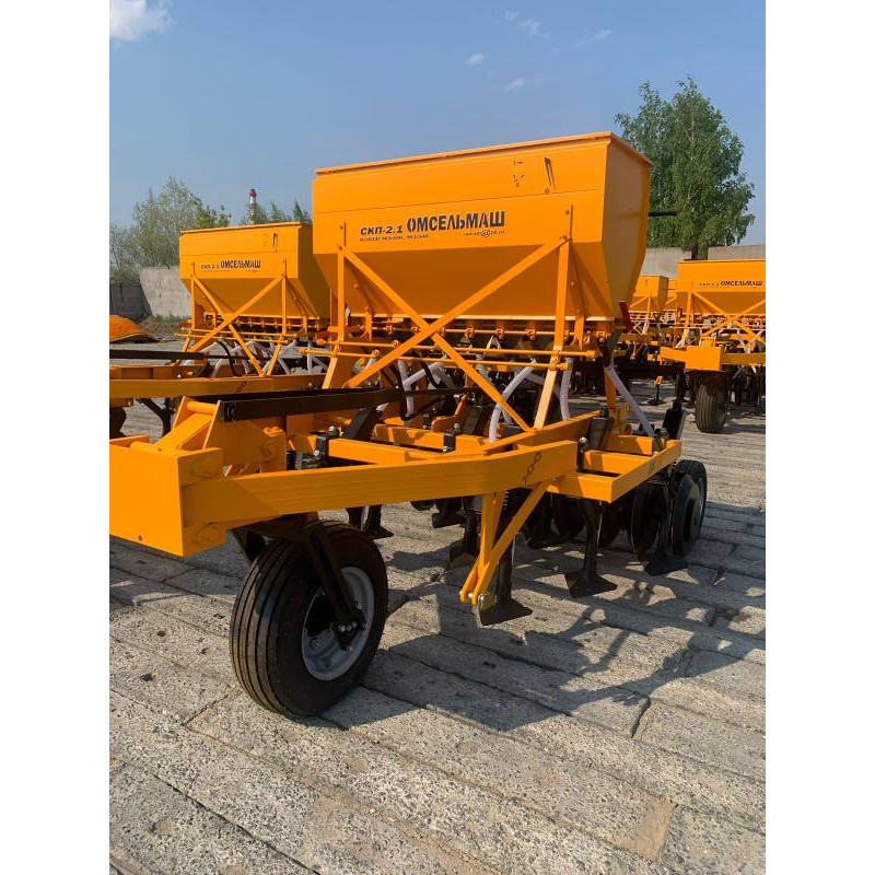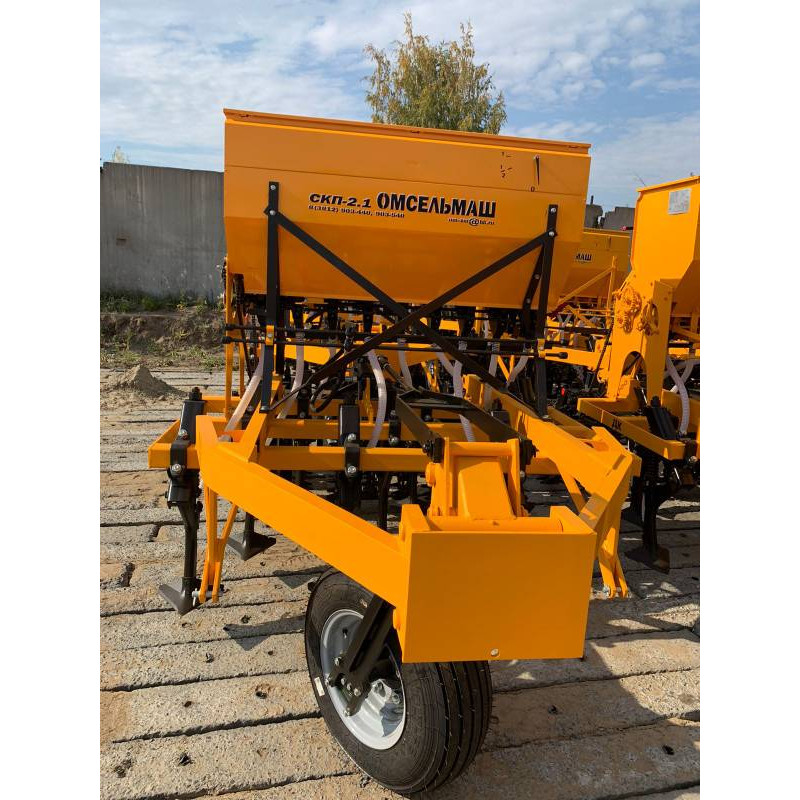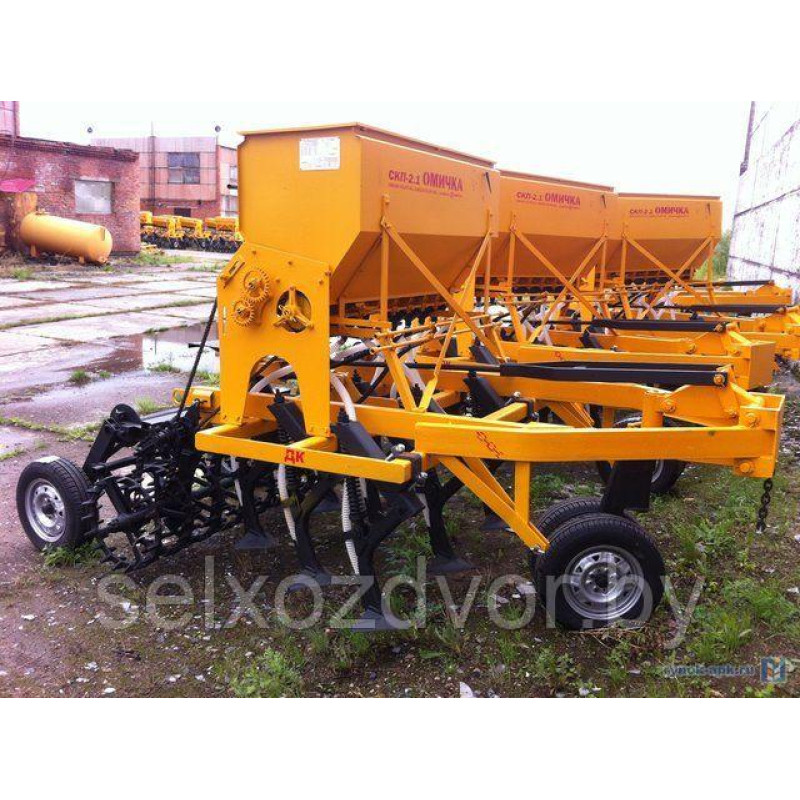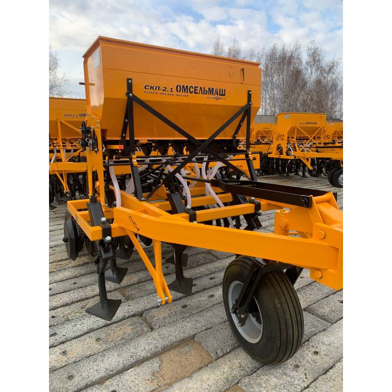 Сеялка СКП-2.1 "Омичка" является базовой модификацией. Предназначена для полосного посева зерна и зернобобовых культур полосой 18-20 см с одновременной предпосевной культивацией, внесением минеральных гранулированных удобрений и полосным прикатыванием почвы после посева на стерневых и безотвальных стерневых фонах, а также для культивации паров.
