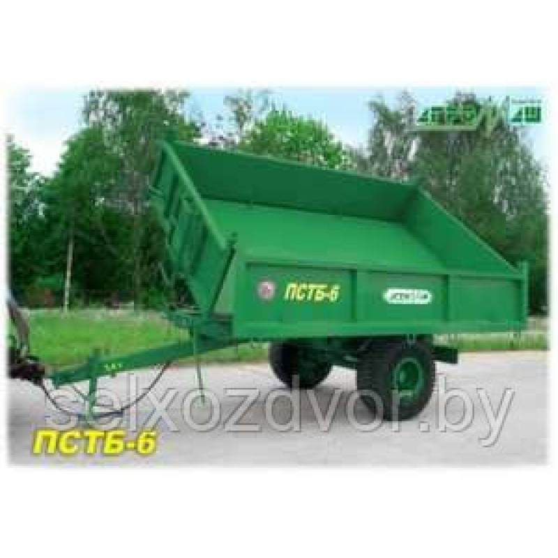 Полуприцеп самосвальный ПСТБ-6 предназначен для транспортировки различных сельскохозяйственных грузов, зерновых, корнеплодов, органических удобрений, строительных материалов и других грузов с выгрузкой на три стороны. Полуприцеп одноосный с двумя шинами типа 16,5/70-18 оборудован пневматическими тормозами и светосигнальным оборудованием.