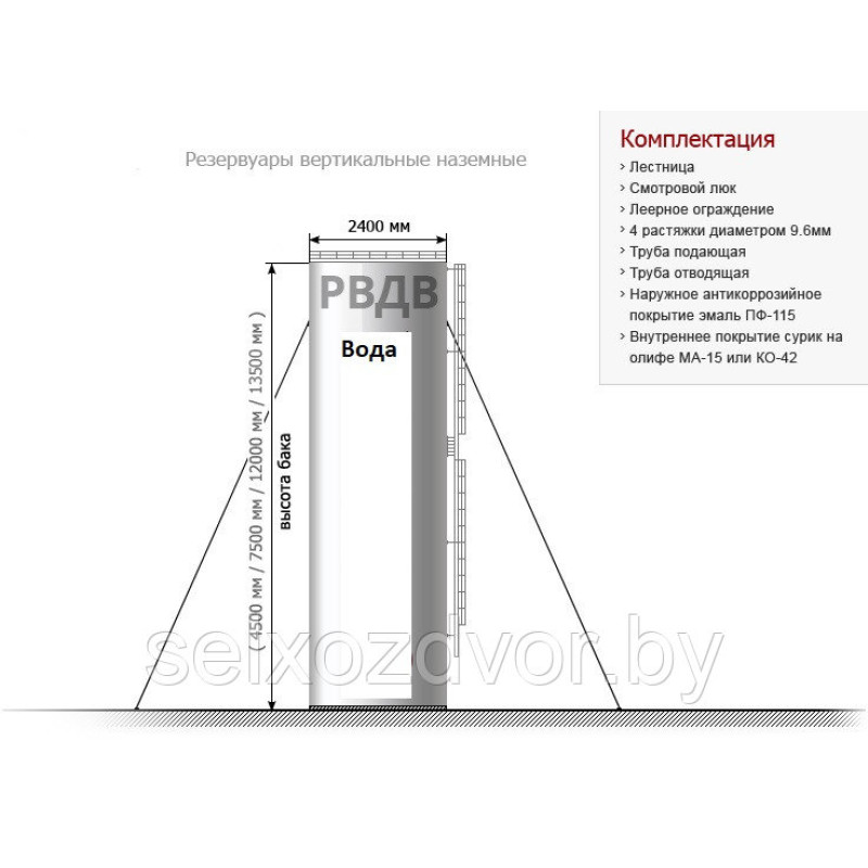 Продажа емкостей для воды вертикальных осуществляется в полном комплекте с навесным оборудованием. Вместе с резервуаром покупатель получает полный комплект крепежных элементов, лестницы для подъема на верхнюю часть резервуара, трубы подающие и отводящие. Также могут быть изготовлены емкости по индивидуальным размерам и укомплектованные согласно желанию заказчика.